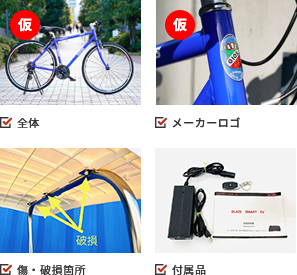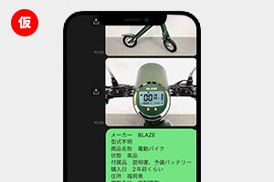 写真の送付とともに、メーカー、型式が分かる箇所(表示箇所が不明な場合は「型式不明」と記載ください。)、商品名称(例:ロードバイク・電動自転車等)、商品の状態、お住まいの都道府県、希望買取方法(出張、宅配)を添えてメッセージを送信ください。
