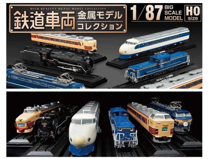 日本各地を駆けぬけた、時代時代の人気車両が集結する「鉄道車両金属モデルコレクション」です。113系電車 東海道本線・583系電車 特急「はつかり」・C62形 蒸気機関車・新幹線 500系電車などがラインナップされます。