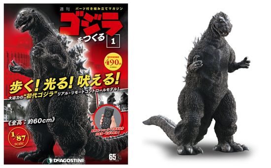 全80号でつくる、デアゴスティーニのゴジラ完成キットです。全号集めて、付属のパーツを組み立てると、歩いたり、吠えたり、背ビレが発光するなどのリモコン操作が楽しめます。