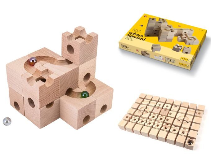 CUBORO(キュボロ)は、玉の通る溝のついたパーツを駆使して塔を作り、上から玉を落として遊ぶ知育玩具です。キュボロ スタンダード16、32、50ピース、CUBORO ジュニア 40ピースなどがラインナップされます。