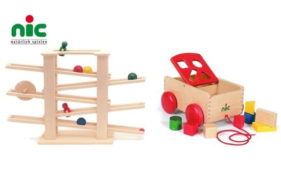 ニック社の人気知育玩具は、玉や人形がゆっくり落ちる「ニックスロープ」、引き車の「 N車付ポストボックス」、動きを楽しむ「ドラム玉おとし」などが人気のモデルになります。