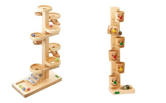 小さな子どもに大人気の、鉄琴の音色が楽しめる「トレイクーゲルタワー(玉の塔、白木のトレイ」、ベック社のベストセラー「ばけつの玉落とし(ローラーカップ」などがあります。