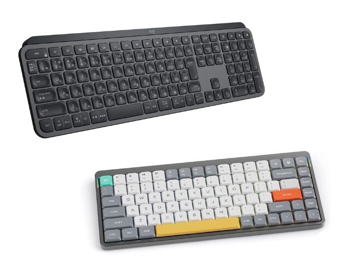 充電式のロジクール/アドバンスド ワイヤレスキーボード KX800 MX KEYS、レシーバー及び有線接続にも対応するNuPhy Air75メカニカルキーボード/薄型ワイヤレスキーボードなどがあります。