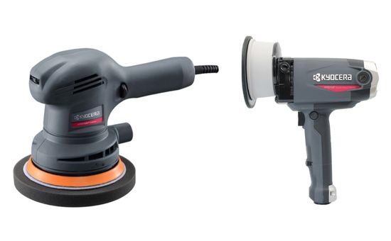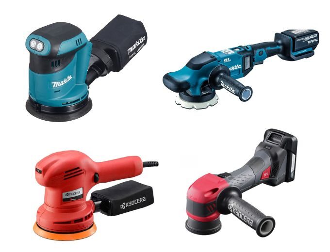 次に自動車用の研磨機(電動ポリッシャー)です。こちらも大変需要が高い工具で、自動車ディーラーでも多く用いられます。マキタの充電式ランダムオービットポリッシャ「 PO500DZ」、「PV300DZ」。京セラの電子シングルアクションポリッシャー「 PE-201」、「RPED132」など、使われるシーンが多い商品です。