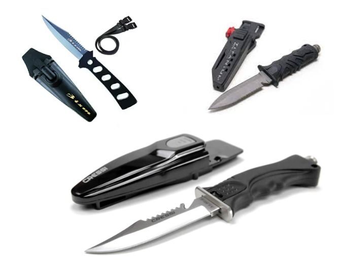 スキューバダイビングに必須と言われるダイバーズナイフです。海中で使用するため刃は錆びにくいステンレスになります。また、水中浮力の関係で、持ち手のグリップは中空で、刃よりも浮力のある樹脂が用いられるなど、特殊な加工が施されます。