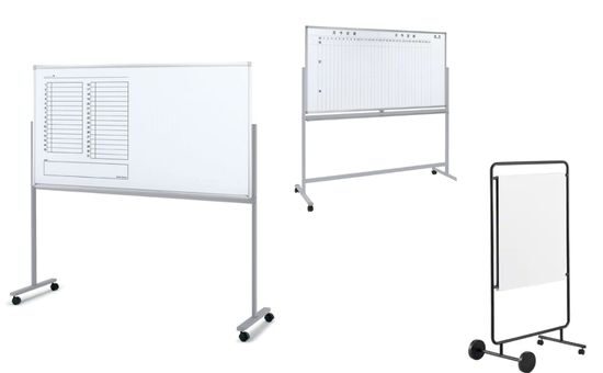 脚付きのホワイトボードの他、行動予定の情報共有にも活躍するホワイトボードです。コマイのホワイトボード 両面 回転式 マグネットの他のにも、片面に縦書きの月予定表が付いている商品などがあります。