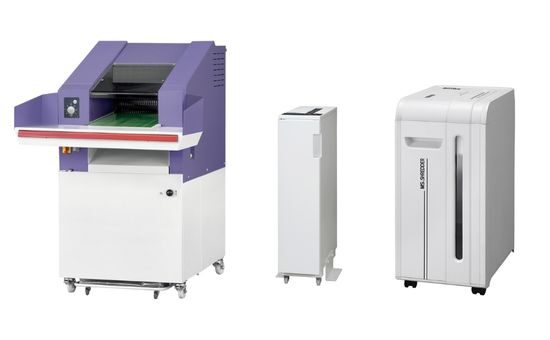 シュレッダー国内シェア7割を誇る、明光商会です。大型シュレッダーシリーズのMSO-1000Bは1000枚を一括投入できる他、データメディア専用シュレッダーなどもあります。