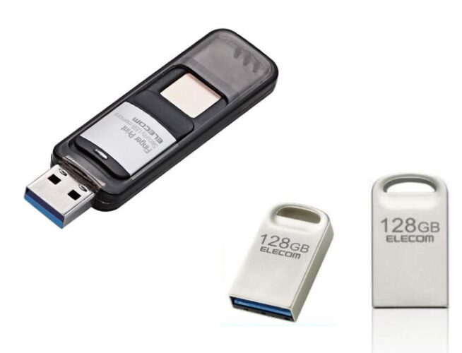 エレコムのフラッシュメモリ(USBメモリ)「指紋認証付きセキュリティUSBメモリ/64GB MF-FPU3064GBK」「USBメモリ 超小型(Mac/Windows11対応) MF-SU3A128GSV」を強化買取中です。