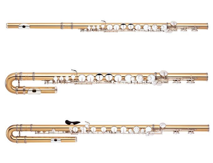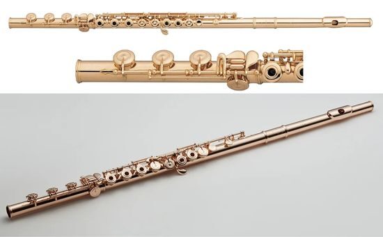 世界に先駆けてゴールドフルートを開発した三響フルートです。ゴールドフルートは10K・14K・18K・24Kと分けられます。その他、シルバーフルート、木管、ピッコロ、ダモーレなどがあります。