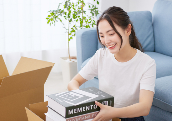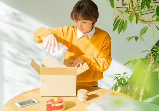 段ボールに、大きい商品・箱型の商品から詰めます。緩衝材やラップ・レジ袋などに包みながら詰めると、運送中の汚れや濡れを防ぎます。