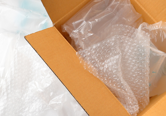 キズがつきやすい物や割れ物の場合は、入念に緩衝材で包みます。それ以外の商品でも、運送中の汚れや濡れ防止のために、緩衝材やラップ・レジ袋などで包みます。